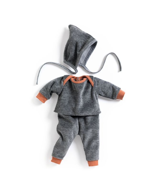 Una tenuta comoda in velluto, composta da pantaloni, una felpa e una cuffia. I pantaloni elasticizzati in vita e la felpa con chiusura a strappo sul retro permettono ai piccoli genitori di vestire facilmente la bambola. Perfette per le bambole della serie Baby Pomea di Djeco.