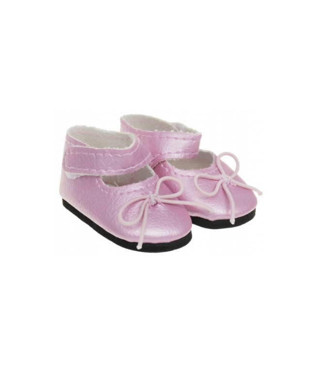 Scarpe tipo ballerina rosa con chiusura alla caviglia, fiocchetto e suola nera griffata. Per bambola di altezza cm 32. Il prodotto fa parte della linea abiti e accessori dedicata alle bambole Las Amigas.