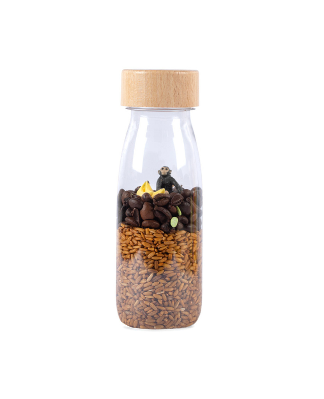 Con la bottiglia sensoriale Sound, l’identificazione visiva dei pezzi si unisce alla stimolazione uditiva, particolarmente importante nel primo anno di vita del bambino.