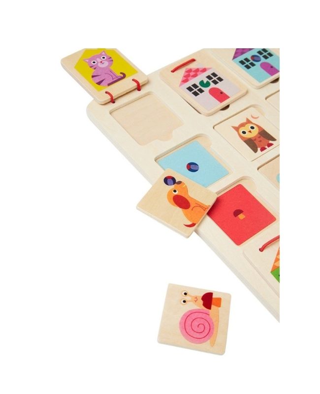 Qual è la casetta di gatto? E quale quella di tartaruga? Prendi le tessere di legno, osserva l’indizio disegnato sotto di esse e vai alla ricerca della giusta casa: se avrai scelto bene, aprendo la porta troverai la conferma! Un divertente gioco di cerca e trova, con dinamiche da puzzle nell’incastro delle caselle, tutto in legno e con disegni coloratissimi.