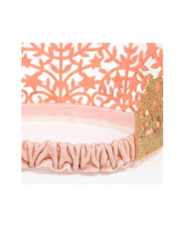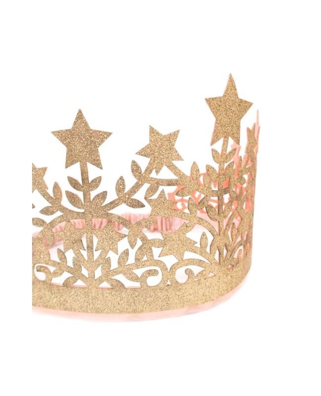 Una scintillante corona con foglie e stelle dorate glitterate, comodissima da indossare grazie al morbido elastico ricoperto di vellutino rosa che circonda il capo. Perfetta per i travestimenti da principessa, regina, fata o per essere indossata in occasioni davvero regali!