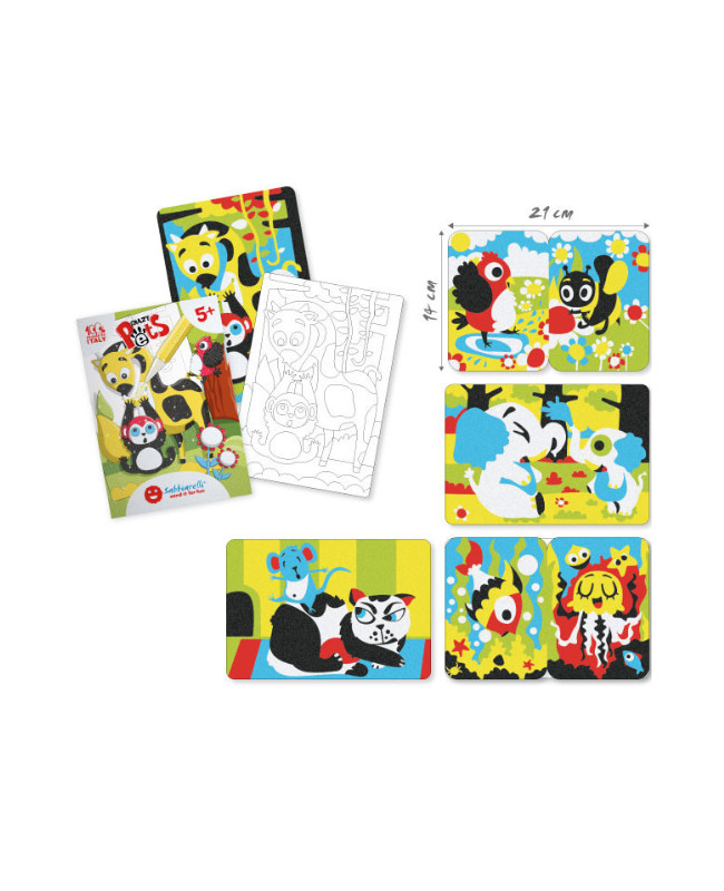 La confezione comprende 7 disegni preincollati da colorare con la sabbia, ciascuno raffigurante un simpatico cucciolo giocherellone La sabbia Sabbiarelli è naturalmente luminosa e priva di glitter aggiunti perché deriva dal prezioso marmo di Carrara quindi, oltre a portare ad una resa davvero speciale, è anche amica dell’ambiente perché utilizza il residuo di lavorazione di un prodotto d’eccellenza. Nel Kit sono comprese 6 colori in penne ricaricabili. Divertiti a decorare i cuccioli e utilizzali come biglietti per gli amici o come quadretti per rallegrare la tua stanza. Sabbiarelli è un’azienda 100% made in Italy.