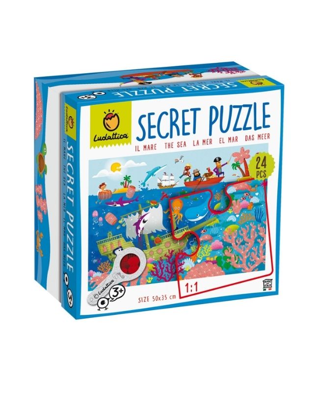 Componi il puzzle di 24 pezzi e, una volta finito, continua a divertirti vestendo i panni del detective: usa la lente speciale e vai alla ricerca di tutti gli elementi nascosti dentro l’illustrazione! Il puzzle finito misura cm 50 x 35.