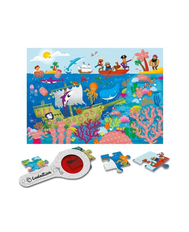 Contenuto: 24 tessere puzzle in robusto cartone, 1 lente speciale in cartone e plastica.
