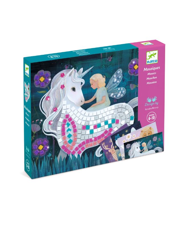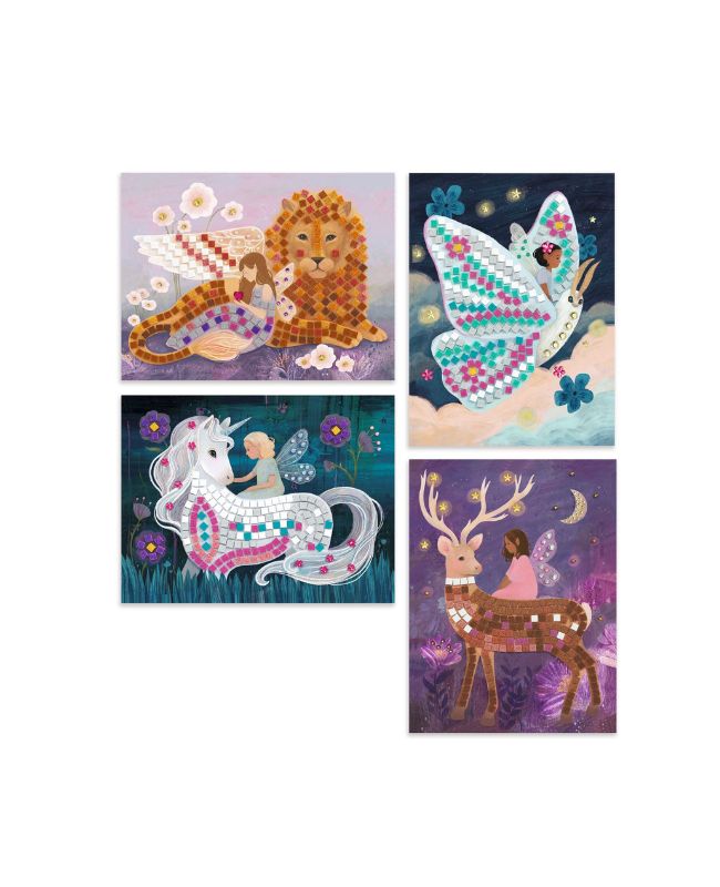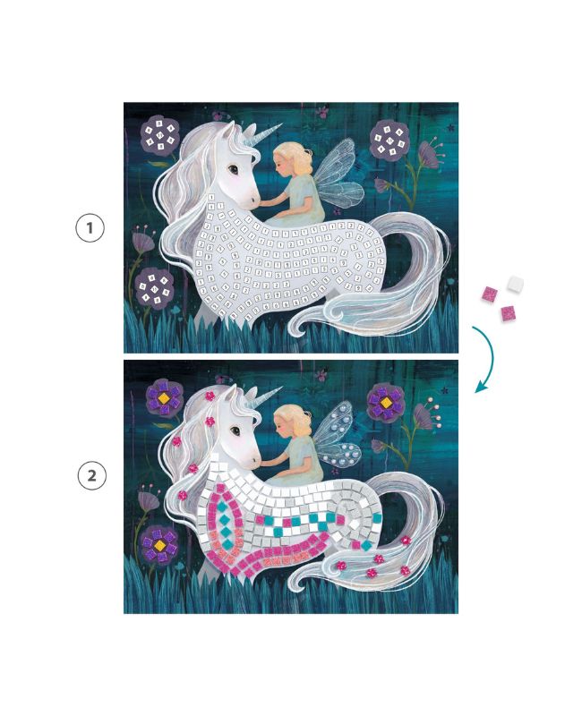 Scopri il mondo del mosaico con questo kit completo per realizzare 4 scintillanti quadretti! Segui i numeri segnati sulle illustrazioni, che corrispondono ciascuno a uno dei 12 colori di tessere in dotazione, e applica ogni tesserina al proprio posto per realizzare le decorazioni suggerite dal libretto. Aggiungi i preziosi strass adesivi per un risultato sorprendente! Meglio ancora: usa la tua fantasia per 4 creazioni esclusivamente tue!