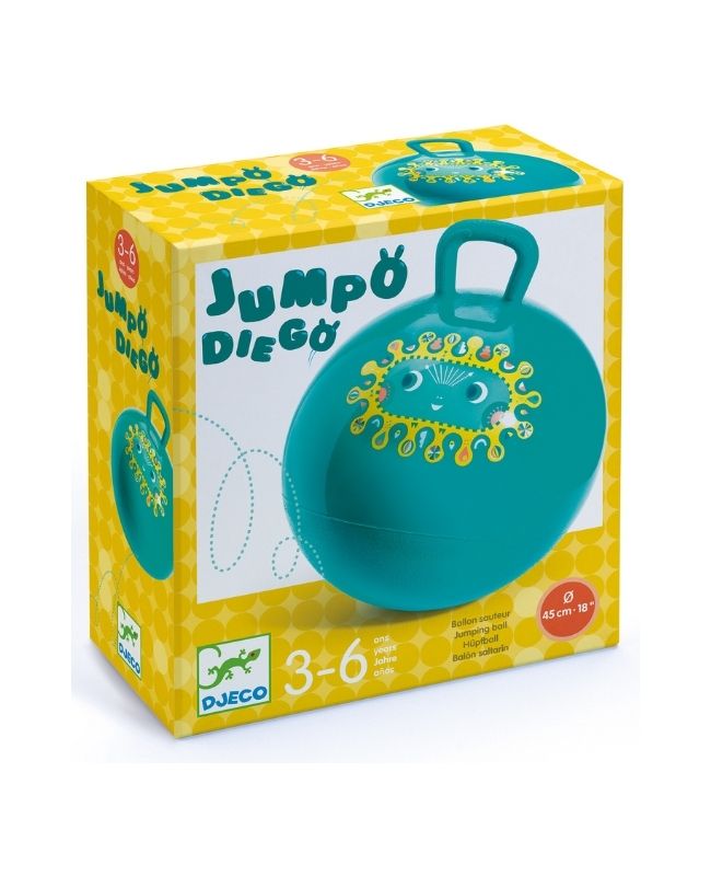 Jumpo Diego è una palla per saltellare da seduto tenendoti stretto al maniglione. Un gioco divertentissimo per fare movimento, sicuro grazie al materiale in PVC rinforzato, con maniglia di facile presa e del diametro giusto per permettere un completo appoggio dei piedi a terra.