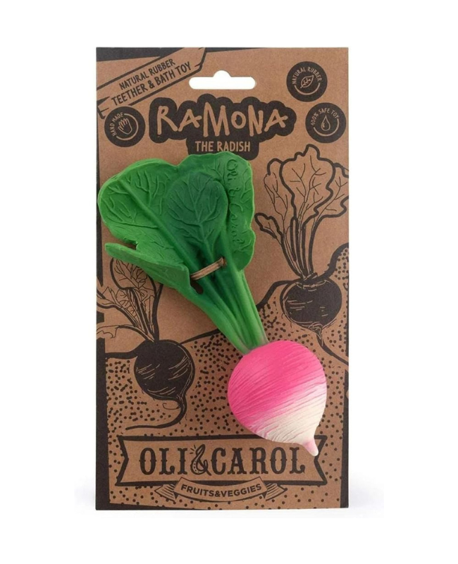 Ramona the Radish è un massaggiagengive a forma di ravanello che stimola i sensi del bambino mentre lenisce le gengive. Le sue dimensioni sono perfette per essere afferrato da piccole mani e le sue texture realistiche aiutano a sviluppare il senso del tatto.