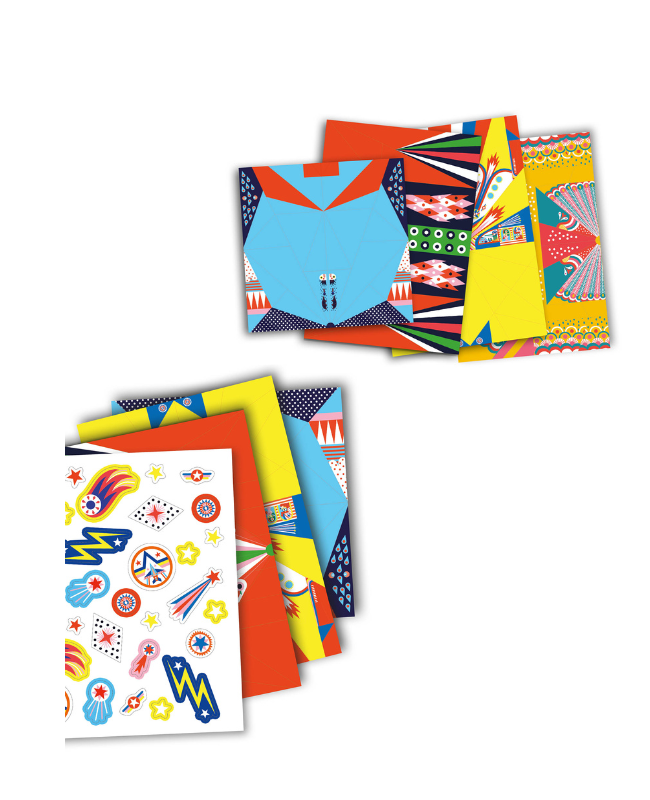 Contenuto: 20 fogli decorati e con linee guida, 1 foglio di adesivi, 1 rampa di lancio, 5 elastici, 1 foglietto di istruzioni con 5 modelli.