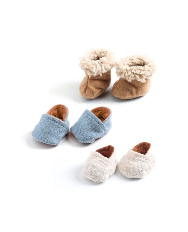 Un set di tre paia di scarpette comode e morbide per i piedini delle bambole. Perfette per le bambole della serie Pomea di Djeco.