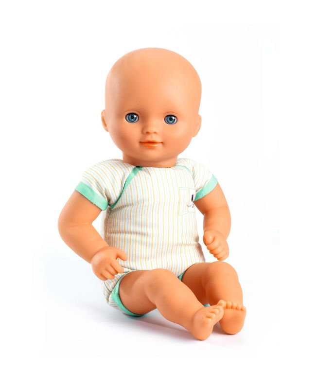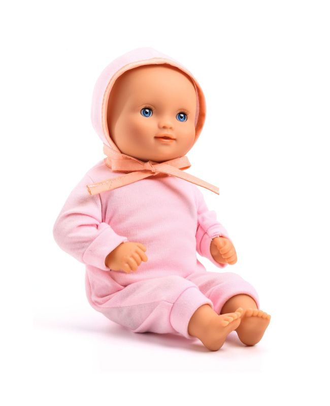 Una bambola adatta a tutti, anche per i piccoli dai 18 mesi di età, con il corpo morbido imbottito con 100% fibra riciclata e testa-braccia-gambe in vinile piacevole al tatto e dal profumo neutro. È leggera e le sue dimensioni (32 cm) si adattano perfettamente alle braccia dei più piccoli. Il suo corpo morbido, su cui è stampato un grazioso “body”, le consente di adottare le stesse posizioni di una bambina vera e la testa può essere ruotata da destra a sinistra. Con i suoi occhi assonnati, si addormenta quando viene appoggiata sulla schiena.