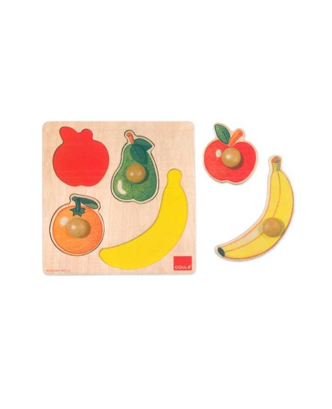 Una tavoletta in legno in cui si incastrano quattro grandi forme di frutta dai disegni semplici e colorati, dotate di manopola centrale per aiutare i bambini nella manipolazione. Ad ogni frutto corrisponde la sagoma colorata nella base di gioco. Un primo gioco di incastro, riconoscimento del frutto e del colore abbinato. Un classico della prima infanzia.