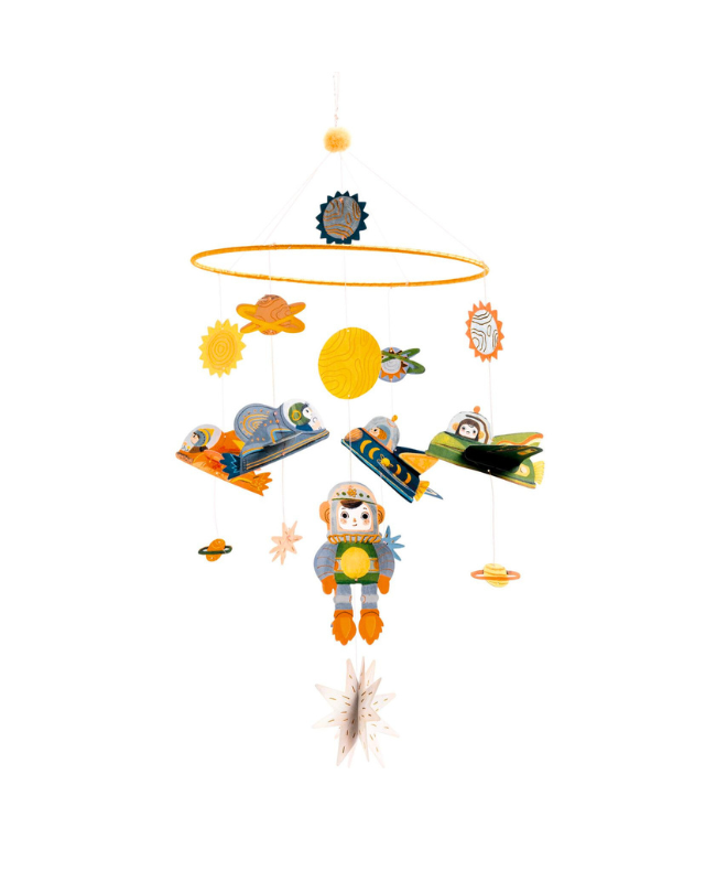 Con i suoi razzi, i pianeti e l’astronauta, questo mobile con tema spaziale è un bellissimo oggetto per decorare la stanza di un bambino. Già assemblato, non devi far altro che fissarlo e ammirare i diversi elementi che si muovono leggeri nell’aria.
