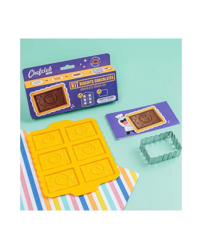 Un tagliabiscotti in metallo per realizzare le basi e uno stampo in silicone per preparare lo strato di cioccolato. Entrambi si lavano comodamente in lavastoviglie e possono andare in congelatore. Il set contiene la ricetta illustrata passo passo e un video per cuocere i biscotti.